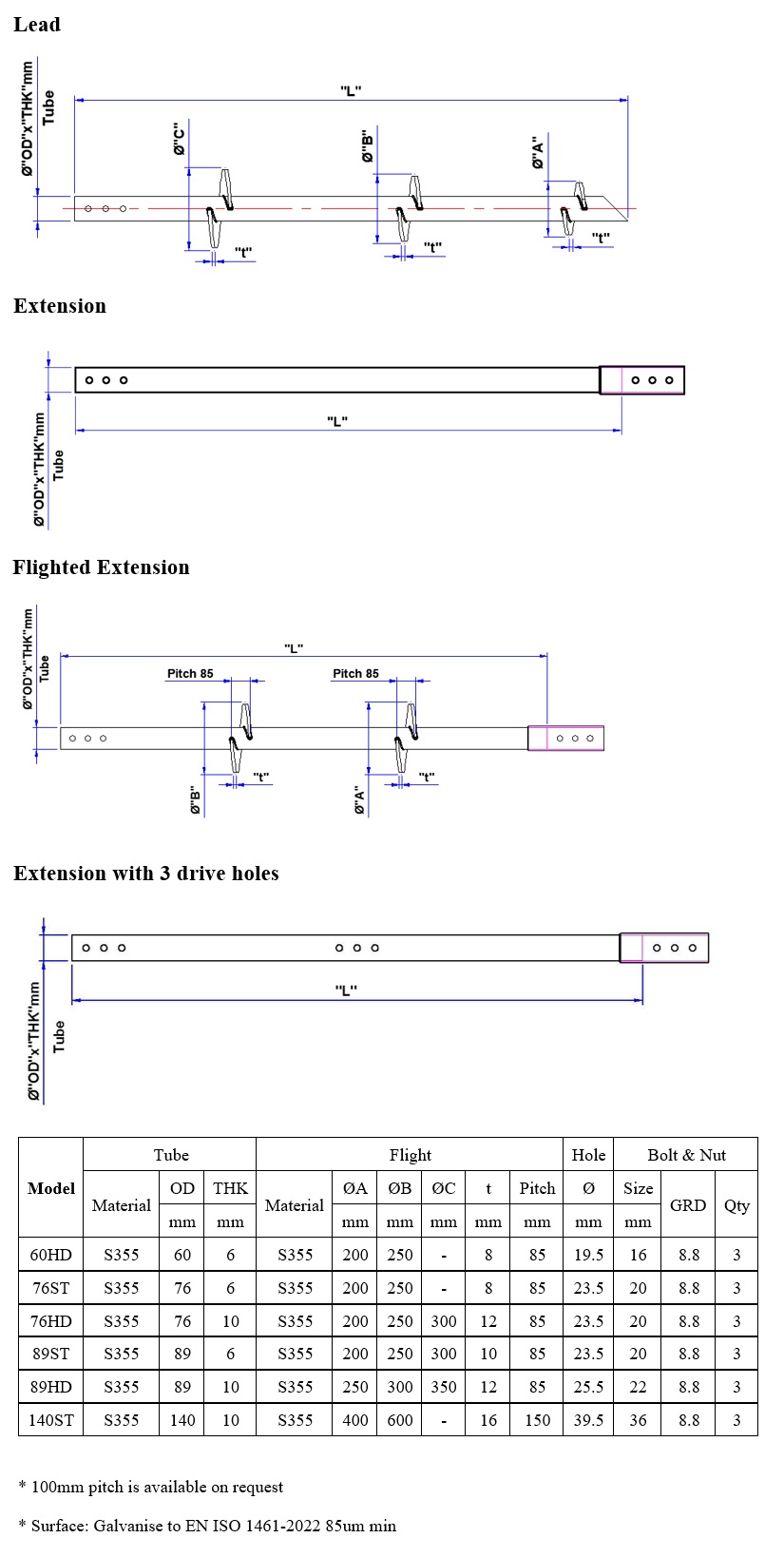 SEA provide a comprehensive range of Screw Piles, suitable for both handheld machines and driven euqipment. Center tubes range from 60mm to 300mm diameter. We hold stock of most sizes at our Redditch warehouse (20 miles south of Birmingham). NEXT DAY DELIVERY to most sites in England for orders received before 2pm. We also produce bespoke items to customer requirements.